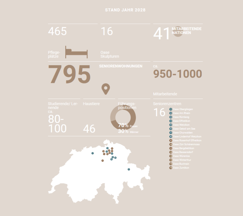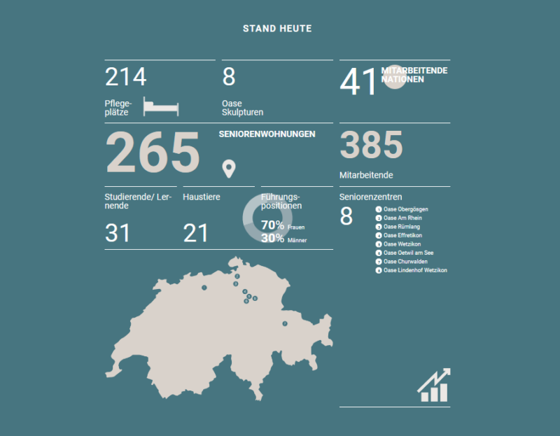 Das Konzept «Läbe Dähei» der Oase Gruppe bietet Bewohnenden die Möglichkeit, aktiv am Leben teilzunehmen. Die Bewohnenden sollen sich in den familiären Wohngruppen wie zu Hause fühlen, indem sie ihre persönlichen Bedürfnisse und