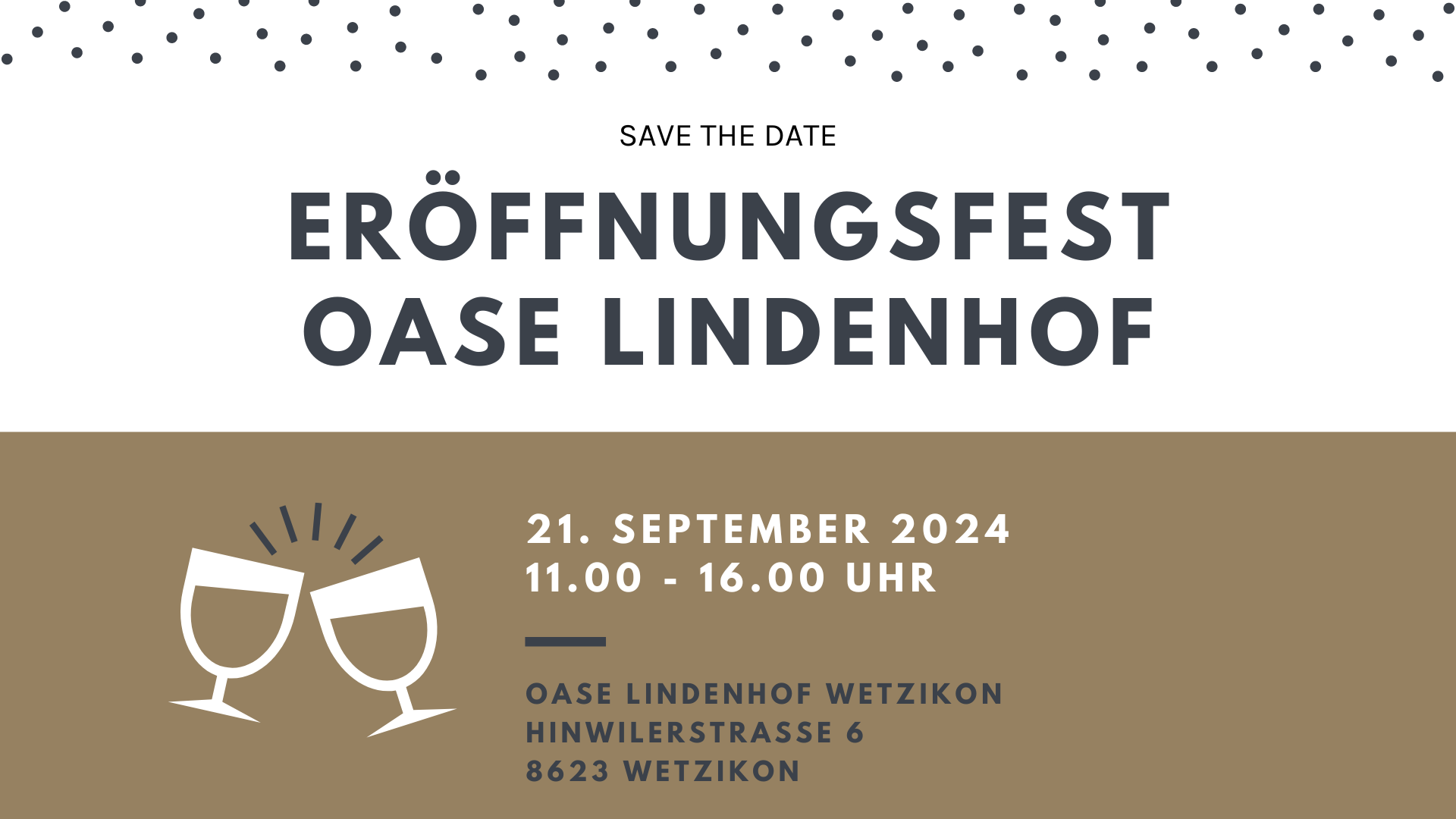Am Samstag 21. September 2024 beim Eröffnungsfest in der Oase Lindenhof in Wetzikon bieten wir Führungen durch die Oase an. Natürlich verwöhnen wir Sie auch kulinarisch, denn alle unsere acht Standorte sind mit einem Foodstand vor Ort.