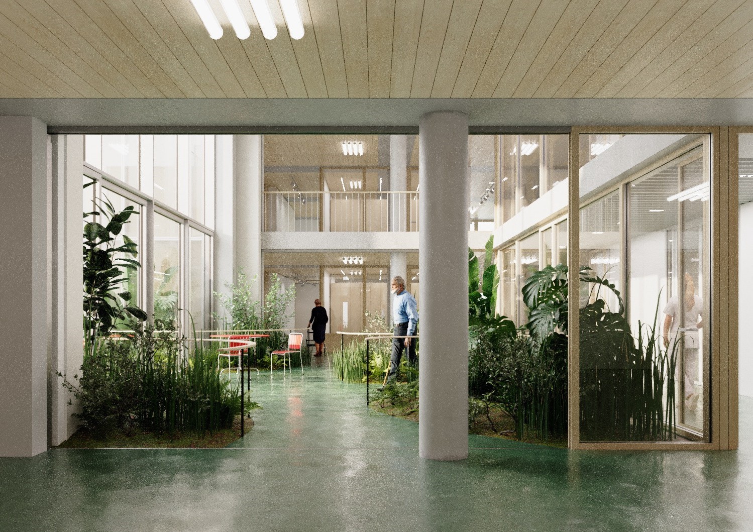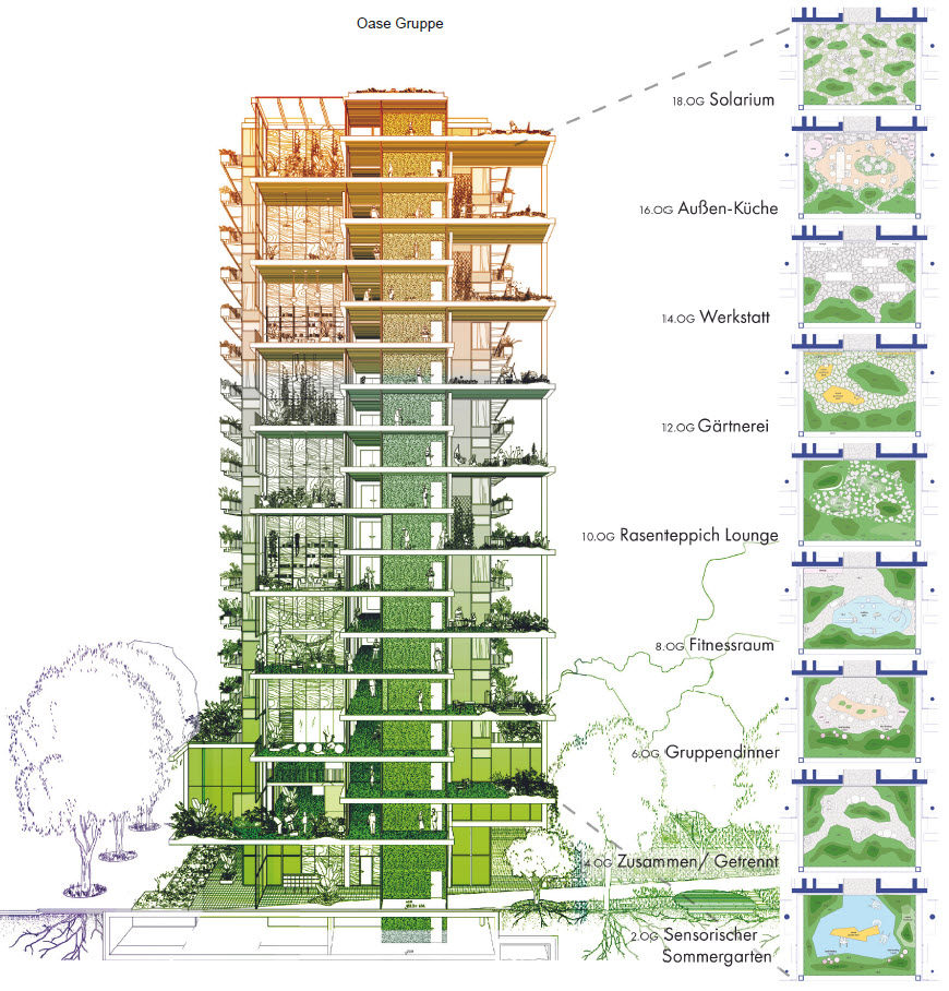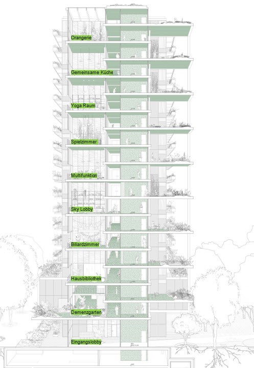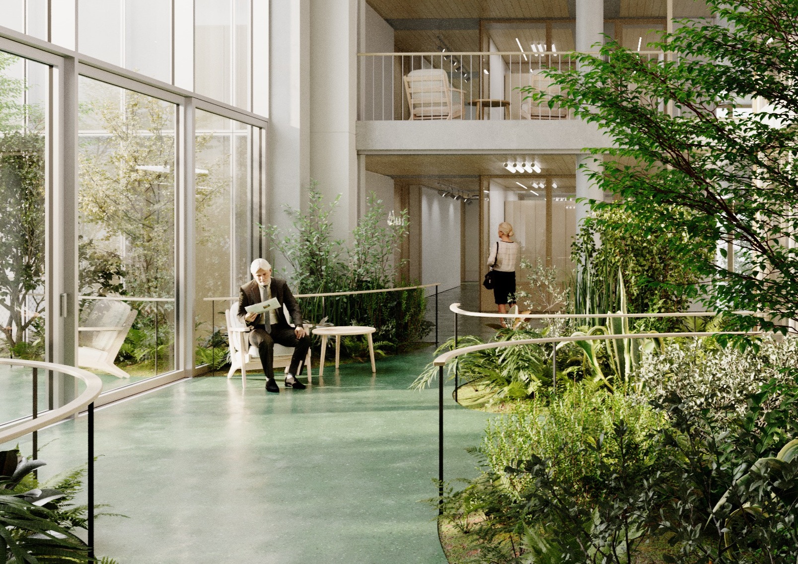 Das Hochhaus ist nicht einfach von einem Park umgeben – es wird selbst Teil des Parks. Für die Bewohnenden bedeutet das: Natur pur – auch im Alltag. Die geschützten Demenzgärten in den unteren Etagen bieten Ruhe und Sicherheit, während der öffentliche Park Raum für Begegnungen schafft. Ob ein Spaziergang, ein Nachmittagskaffee im angrenzenden Restaurant oder eine Aktivität im «Freiruum» – der Park wird zu einem lebendigen Treffpunkt für alle.